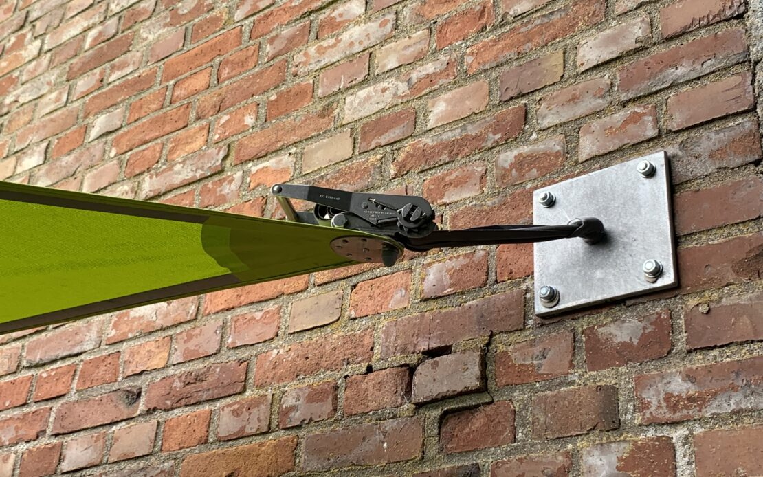 Das farblich auffallende Sonnensegel aus SOLTIS 92 wurde mit Hilfe der Gurtspanner ausgespannt. Die konkave Form der Segelkanten sorgt in Verbindung mit dem aufgeschweißtem Gurtband für ein faltenfreies und stramm gespanntes Ergebnis.