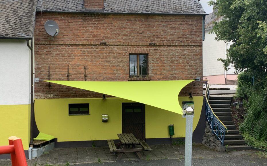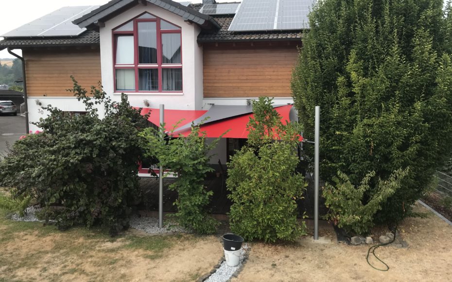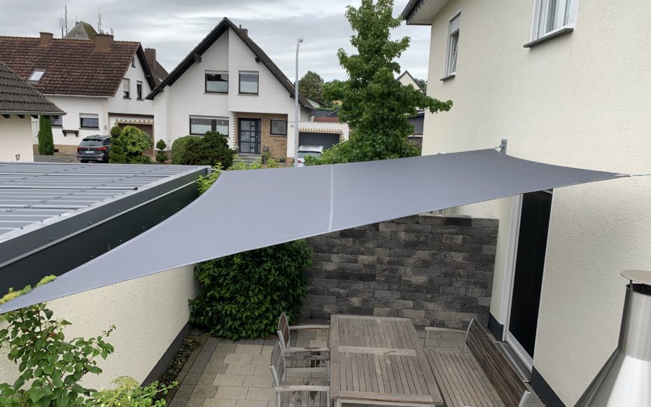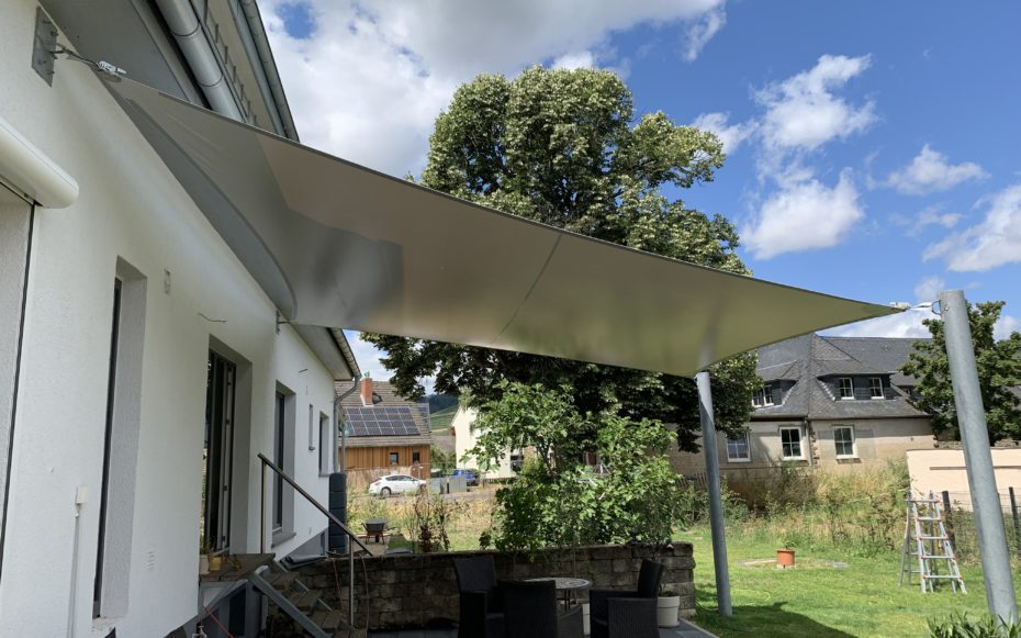 Um die Terrasse vor der Sonne und auch vor Regen zu schützen, wurden zwei Sonnensegel geplant, konfektioniert und montiert.